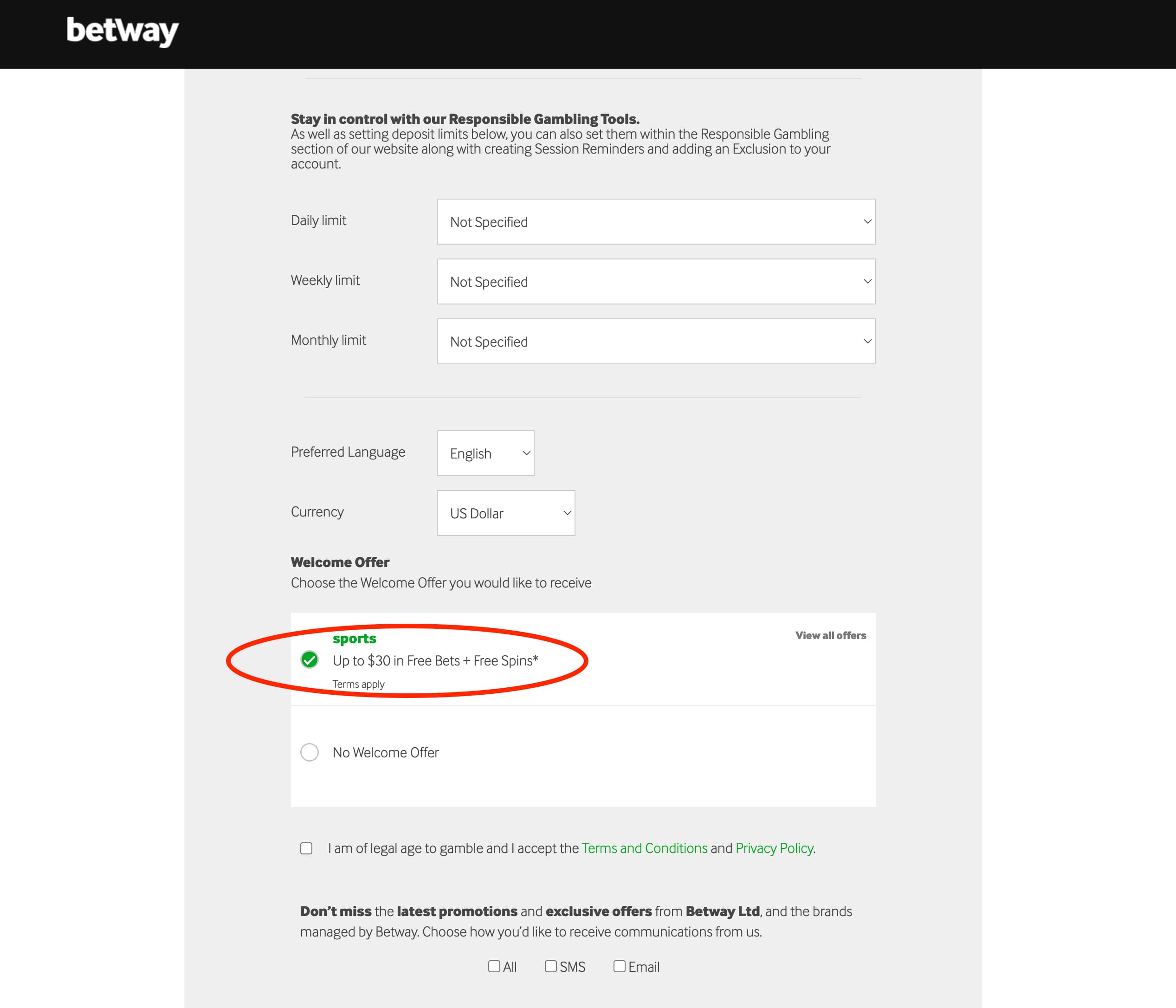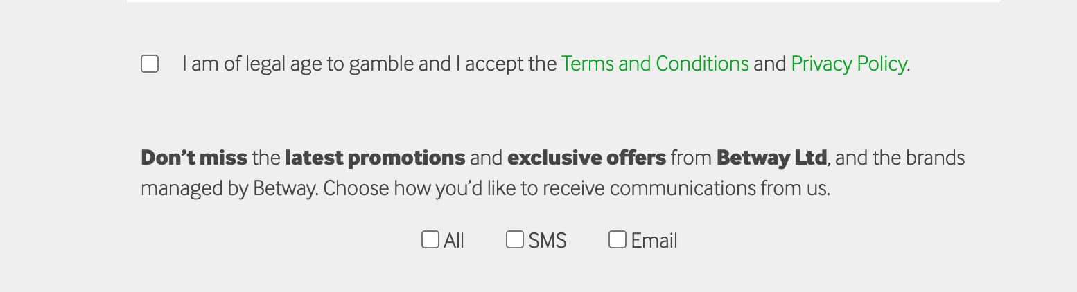 - 약관 동의 및 가입 완료: Betway 이용 약관에 동의하고 ‘등록’ 버튼을 클릭하면 가입이 완료됩니다. 등록한 이메일 주소로 환영 알림이 발송됩니다.